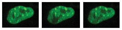 Pro studium procesu asociace a disociace chromatin-binding proteinů (HP1, H1) na DNA in vivo bylo použito fluorescenční značení (fluorescent tag) pomocí žlutého fluorescenčního proteinu (YFP). V jádrech myších embryonálních kmenových buněk byla mikroskopem pozorována fluorescence (Obrázek 1, vlevo) potvrzující přítomnost označených proteinů (HP1, H1). Pro studium odehrávajících se dynamických procesů bylo metodou FRAP vysvíceno (photobleaching) určité konkrétní místo v pozorovaném jádře – umožněno modulem pro aktivní osvětlení. Následovně se díky možnosti snímání v čase získal signál zachycující remodelace chromatinu a změnu fluorescenčního signálu na vysvíceném místě v pozorovaných jádrech.