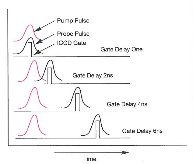 Časově rozlišená Ramanova spektroskopie (Time-Resolved Raman Spectroscopy, TRRS) umožňuje studovat mikroskopické procesy, které se odehrávají ve velmi krátkých časových intervalech. Dopadající laserový pulz vyvede zkoumaný materiál ze stavu termodynamické rovnováhy a jednotlivé molekuly se tak ocitnou v excitovaném stavu. K získání Ramanova spektra takto vybuzených molekul se pak použije stejný laserový pulz (jednobarevný pulzní Ramanův experiment) nebo pulz pocházející od jiného laserového zdroje (dvoubarevný pulzní Raman). Přiložený obrázek znázorňuje typické experimentální uspořádání pro dvoubarevné časově rozlišené měření Ramanova rozptylu pomocí dvou laserů, spektrografu s ICCD kamerou a generátoru zpoždění. Jeden laser slouží k excitaci měřeného vzorku, druhý se používá k sondování změn, které v látce vyvolal excitační pulz. Časový průběh přechodného signálu je monitorován tak, že se zaznamenává série spekter, které odpovídají různým okamžikům po fotoexcitaci.