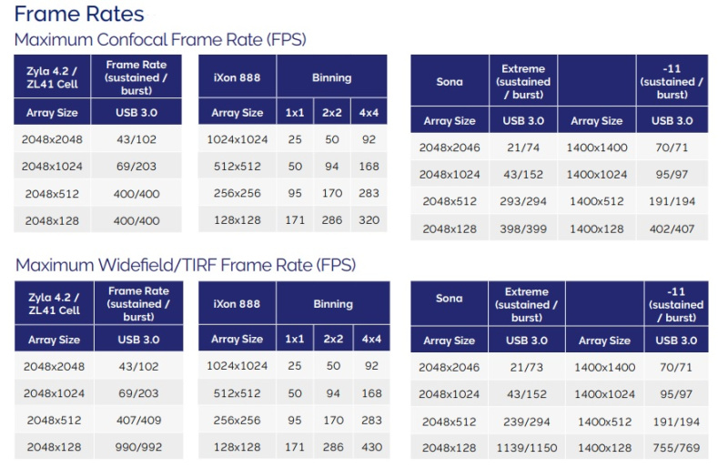 Pro ty nejslabší signály lze použít detektory iXon EMCCD, které zachycují již 1.9 fotonu na pixel s vysokým poměrem signálu k šumu. Nejnovější generace detektorů sCMOS nabízí vynikající rovnováhu mezi citlivostí a rychlostí – kvantová účinnost až 95% a rychlost vyšší než 44 snímků za sekundu při plném rozlišení!