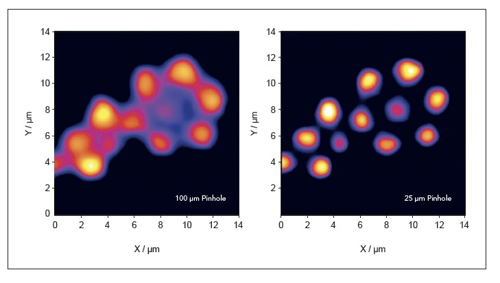 - Truly confocal – k dispozici je více než 10 pozic pinhole od 25 µm do 100 µm