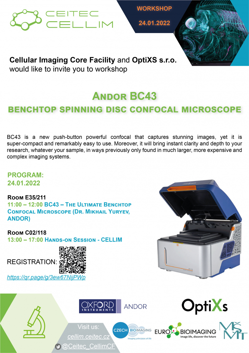 Dne 24.1.2022 proběhne na půdě Sdílené laboratoře Buněčného zobrazování (CELLIM) v Brně workshop s názvem „Andor BC43 – The Ultimate Benchtop Confocal Microscope“, kde ve spolupráci s firmou Andor představíme nový plug & play konfokální mikroskop BC43, který pouhým stisknutím tlačítka poskytuje rychlé 2D a 3D rutinní zobrazování od brightfield po konfokální mikroskopii bez ohledu na typ vzorku.