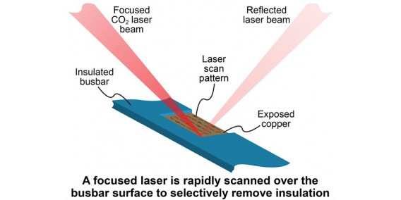 Vzhledem k těmto požadavkům jsou pro odstraňování izolace z přípojnic skvělým nástrojem lasery. Laserový proces je totiž zcela bezkontaktní a lze jej snadno konfigurovat pro práci se zakřivenými díly. Díky tomu je laserové zpracování rychlé a flexibilní. Zejména CO2 lasery jsou pro tento úkol ideální. Je to proto, že CO2 laser produkuje paprsek s vlnovou délkou se specifickými vlastnostmi. Tento paprsek je velmi silně pohlcován většinou plastů používaných pro izolaci a zároveň je vysoce odrážen mědí. To znamená, že laserový paprsek rychle odpařuje izolaci, ale jakmile narazí na podkladový vodič, neškodně se od něho odrazí zpět (protože měď paprsek CO2 laseru pouze odráž místo aby ho absorbovala). Je tedy snadné odstranit izolaci, zatímco měď zůstane zcela neporušená.