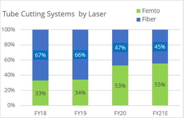 Vláknové lasery již několik let dominují aplikacím řezání a vrtání v průmyslu výroby zdravotnických prostředků díky svým relativně nízkým nákladům, škálovatelnému výkonu a vysoké spolehlivosti. Femtosekundové lasery nabízejí jasnou výhodu z hlediska kvality řezu, ale dlouhou dobu si zajišťovaly jen malý podíl na trhu. To se však najednou poměrně rychle mění, jak dokládají údaje o prodeji řezacích systémů Coherent. Podívejme se, co je příčinou tohoto dramatického růstu podílu na trhu ve srovnání s vláknovými lasery.