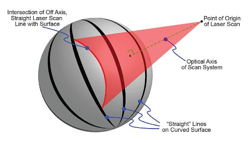 K promítacímu zkreslení dochází při vyznačování "rovné" čáry při jiném než normálním dopadu na zakřivený povrch.