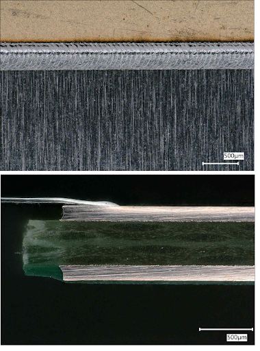 - Vpravo průvar a průřez bodu aplikovaného jednovidovým laserem, velikost bodu ~ 30 µm, který se rychle pohybuje materiálem.