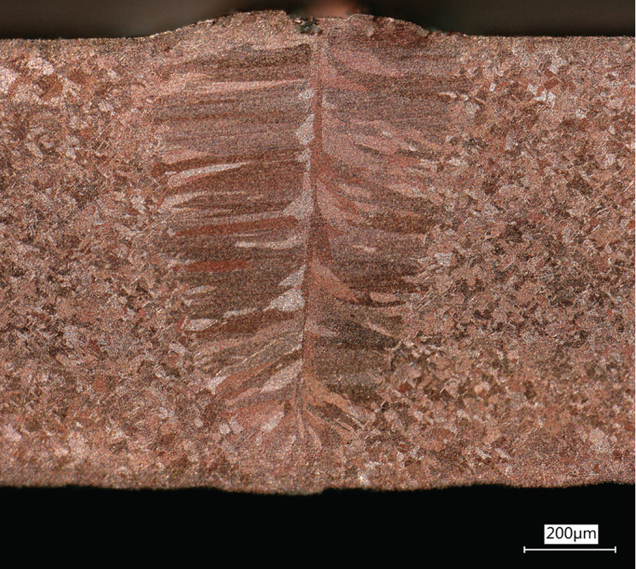 Obrázek 5: Průřez měděného svaru vytvořeného infračerveným laserem ARM s vysokým jasem a výstupním výkonem 3,5 kW při rychlosti svařování 300 mm/s.
