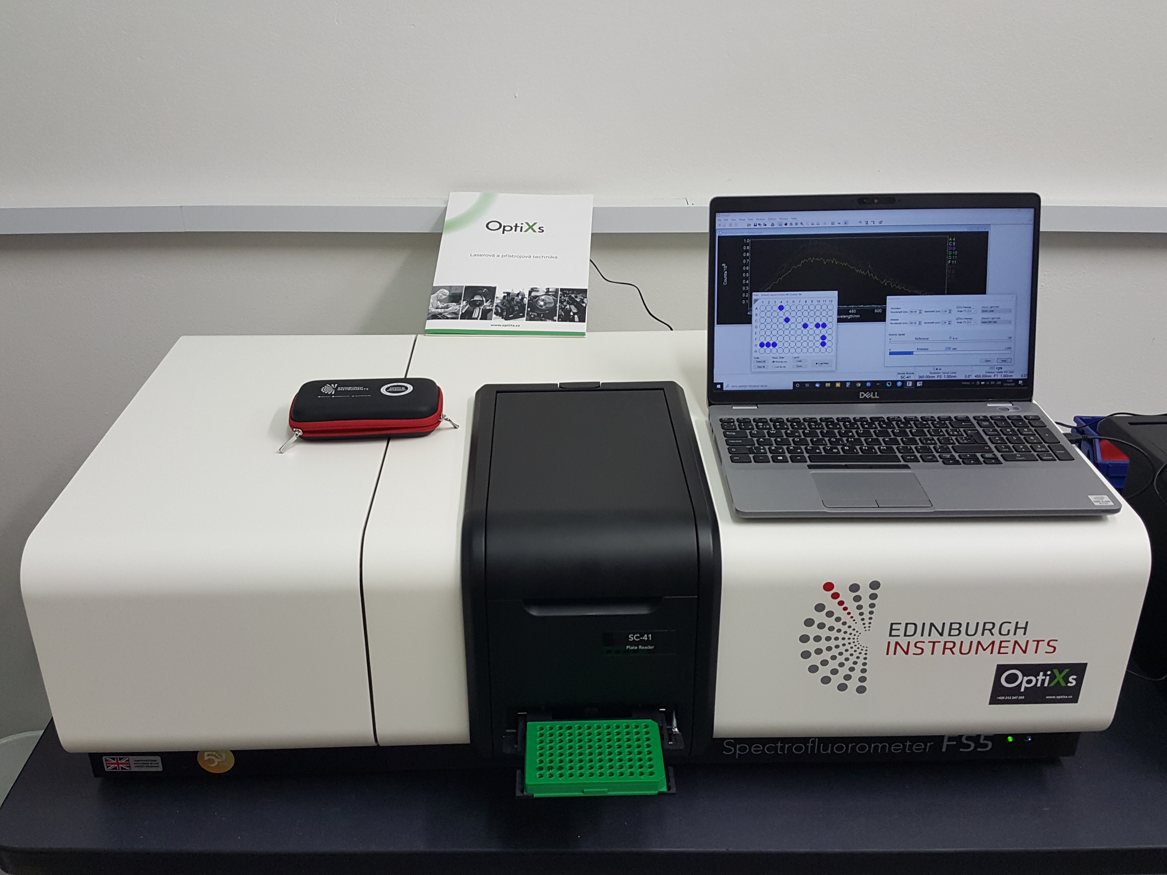 Pro toto zadání jsme zvolili Plate Reader SC-41, který je navíc zcela kompatibilní s modulárním spektrofluorimetrem FS5. Přístroj je určen pro automatizované čtení 96-jamkových mikrotitračních destiček, pro každou jamku dokáže rychle zobrazit excitační a emisní spektrum a je dodáván společně s řídícím softwarem a sadou filtrů.