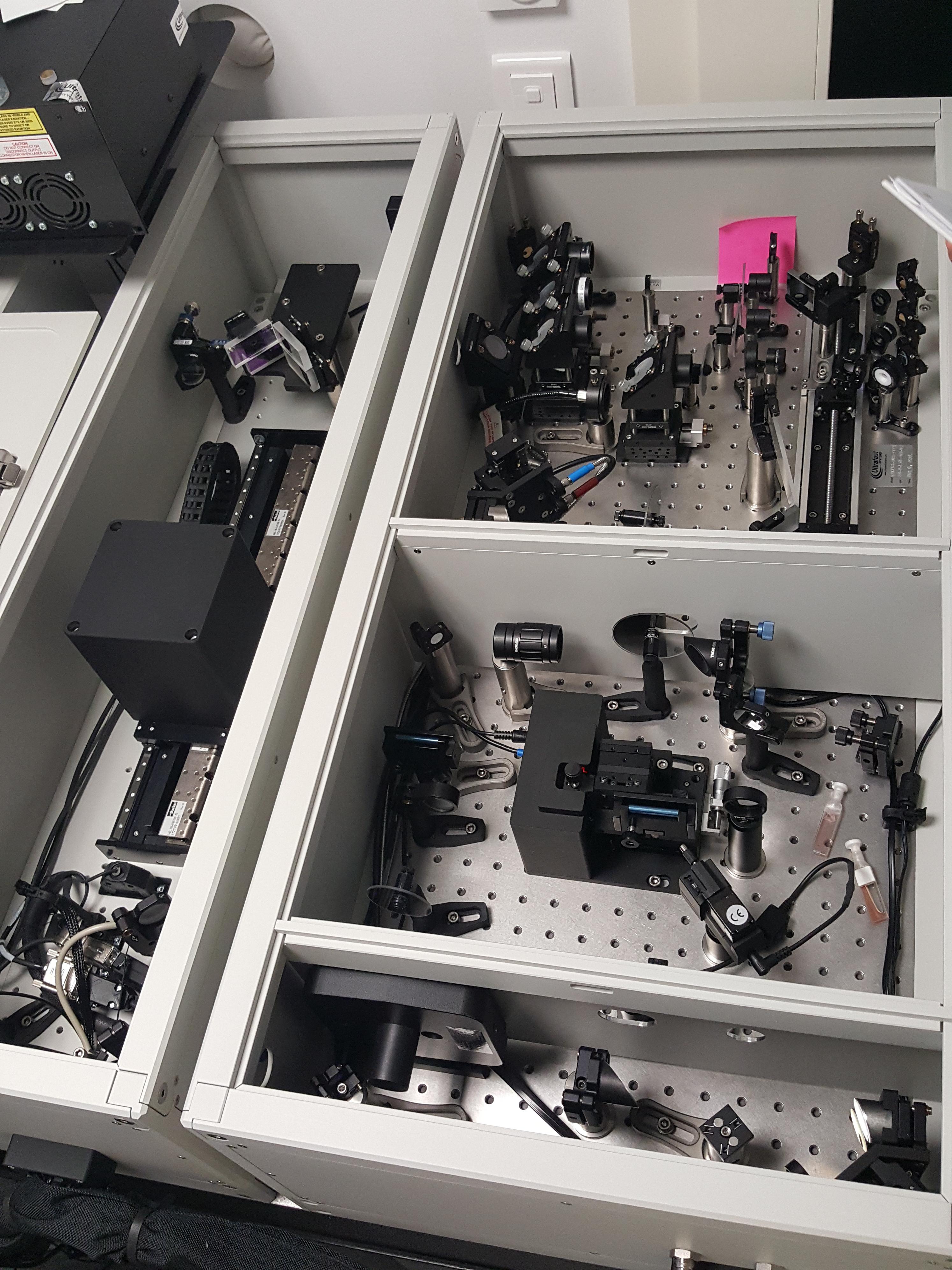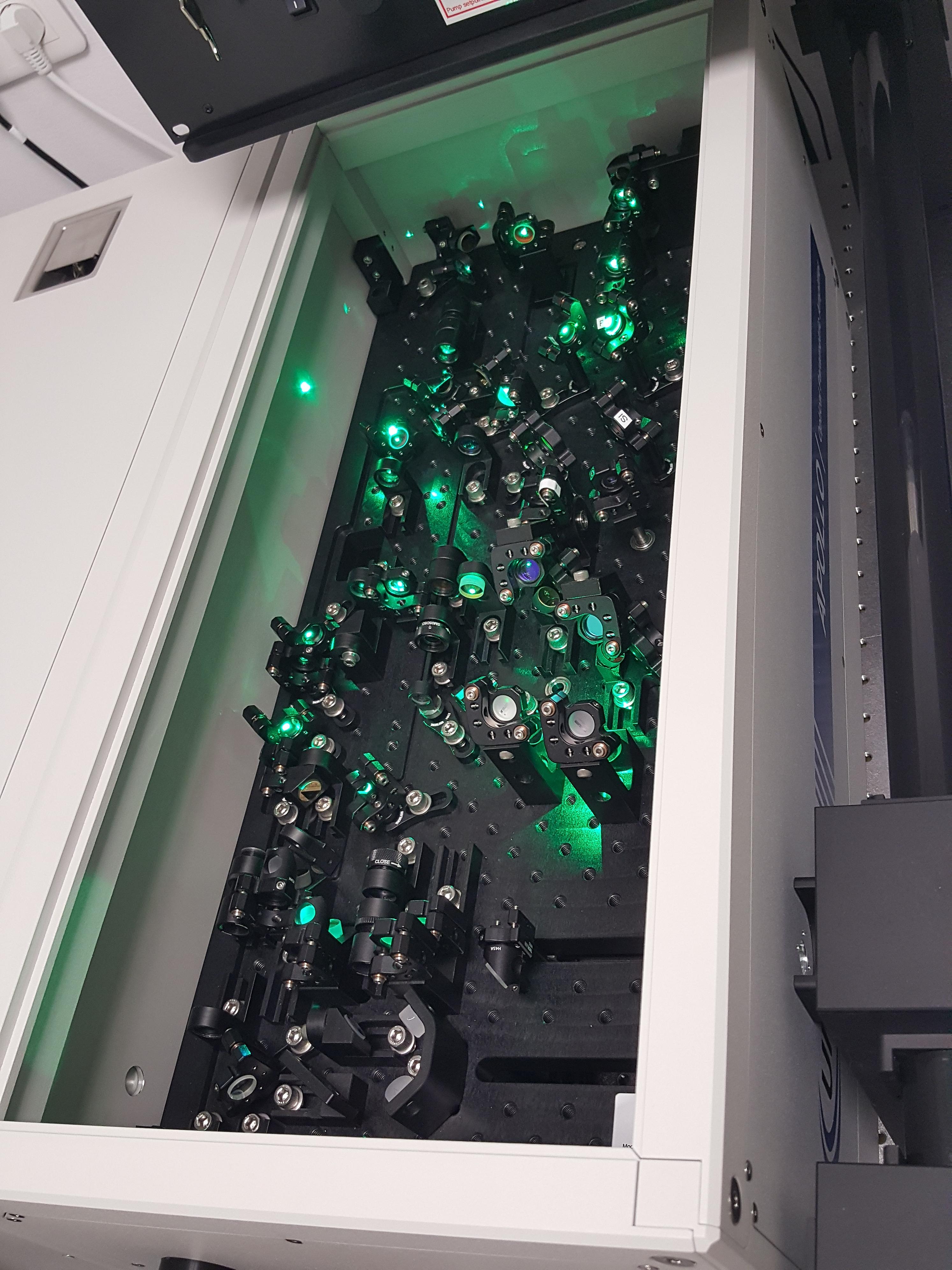 Nanosekundový spektrometr EOS jsme doplnili o femtosekundový systém HELIOS FIRE. Sondovací svazek byl naveden do nové vysokorychlostní optické zpožďovací dráhy (časové okno 8 ns, rozlišení 14 fs) a poté namířen na nelineární krystaly pro generaci UV, VIS a NIR superkontinua. K excitaci byly použity femtosekundové pulzy vystupující z optického parametrického zesilovače (laditelný rozsah 320-1300 nm). Spektrometr byl dále doplněn o motorizovaný držák pro měření transparentních pevnolátkových vzorů a o modul pro měření netransparentních vzorků v reflexním módu. Rozšířený spektrometr dokáže pokrýt časovou škálu od mikrosekund až po femtosekundy a umožňuje záznam přechodné absorpce od 350 nm do 1600 nm.