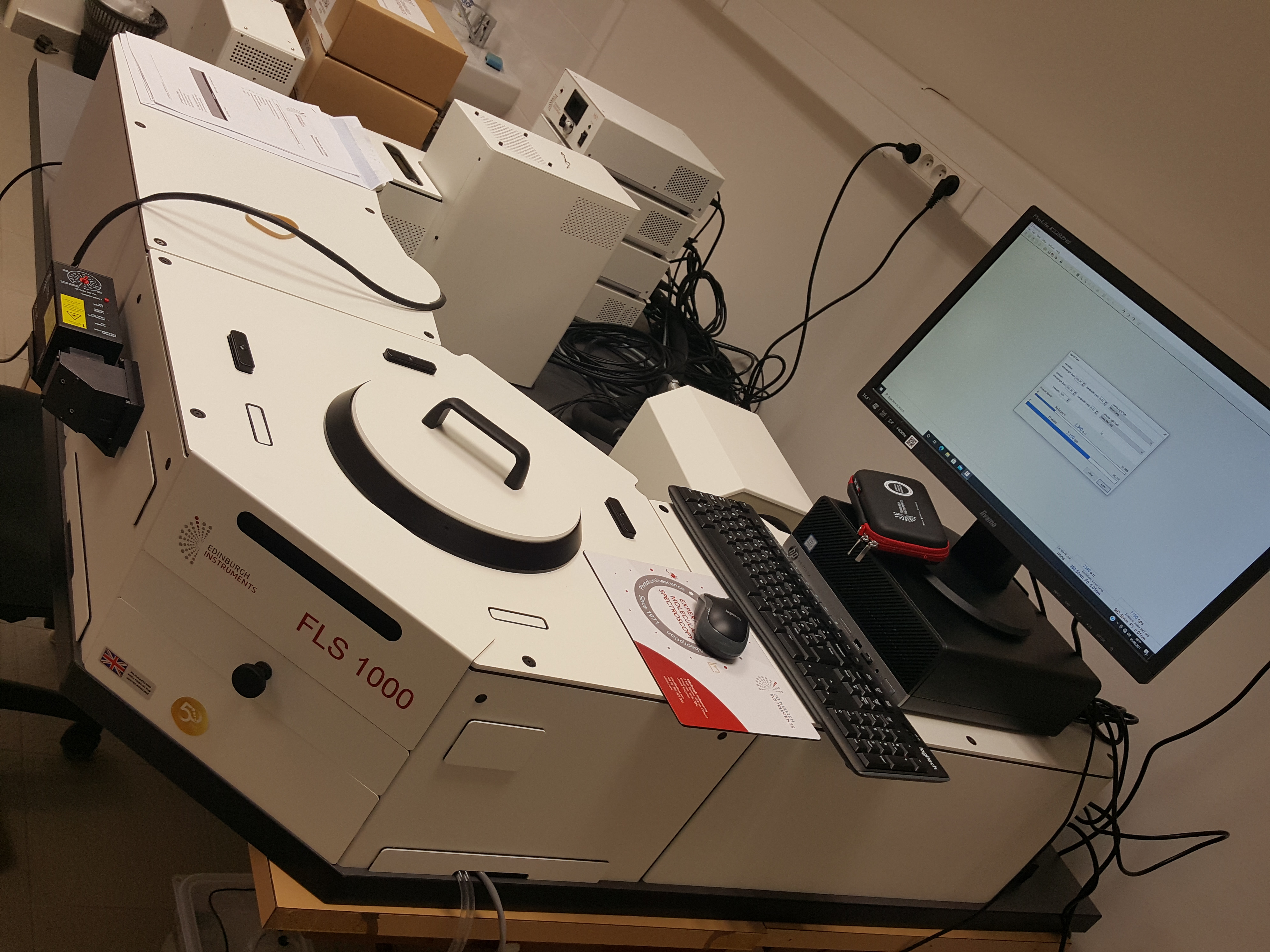 Pro toto zadání jsme zvolili modulární fotoluminiscenční spektrometr FLS1000 s dvojitými monochromátory. Tento vysoce citlivý přístroj dokáže kromě měření ustálených luminiscenčních spekter také monitorovat doby života fluorescence (TCSPC technika) a doby života fosforescence (MCS mod). Systém obsahuje rychlý UV-VIS fotonásobič s šířkou odezvy <250 ps a kapalným dusíkem chlazený NIR fotonásobič.