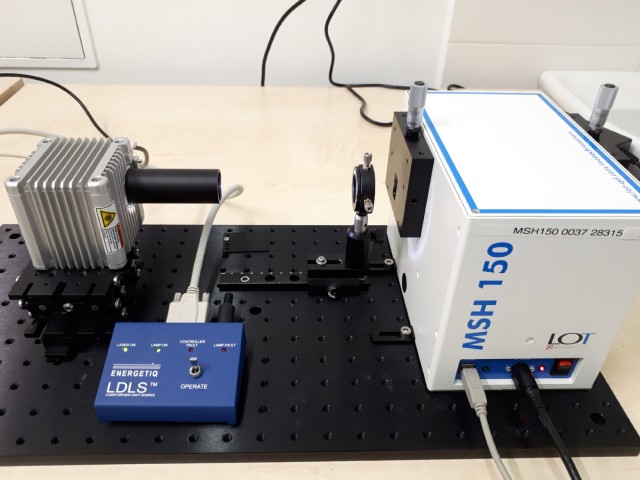 - Czerny-Turner monochromátor MSH-150 s kontrolním softwarem, ohnisková vzdálenost 150 mm, kontinuálně laditelný výstup v rozsahu 200-1300 nm, přesnost nastavení vlnové délky ±0,3 nm