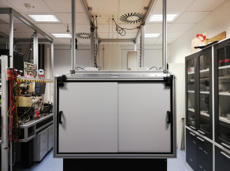 Základní konstrukce našeho krytu je vyrobena z montovaných hliníkových profilů obklopených alubondovými deskami. Po obvodu krytu je dohromady 10 posuvných dveří jejichž poloha (otevřeno/zavřeno) je monitorována pomocí bezpečnostních spínačů. Řídící elektronika krytu je napojena na interlock laseru a ten lze tak v základním stavu spustit pouze, pokud jsou všechny dveře krytu zavřené. Současně s tím je uživatel na spuštění laseru upozorněn světelnou signalizací přímo na krytu a nápisem před dveřmi laboratoře. Díky tomuto návrhu a díky dvoustupňovému zapojení hlavního bezpečnostního okruhu se tak optický stůl s laserem třídy IV stává zařazením třídy I.