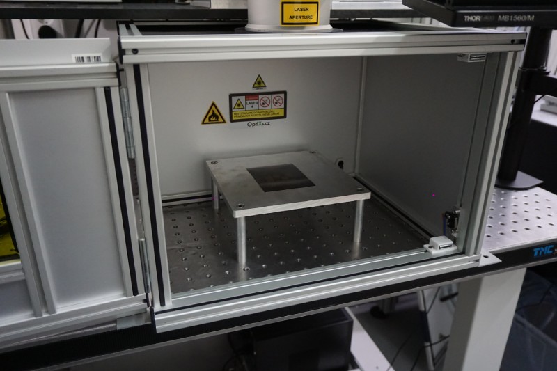 Dle našeho návrhu jsme realizovali kompletní laserové pracoviště, kdy je výstup ze vzduchem chlazeného femtosekundového laseru veden zakrytovanou optickou dráhou do skenovací hlavy, která je pevně umístěna kolmo do vzorkové komory. Sestava je řízena z PC a obsahuje i software umožňující vytváření požadovaných tvarů a obrazců včetně následného řízení laseru a skeneru.