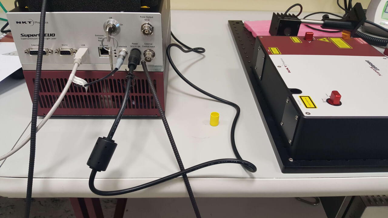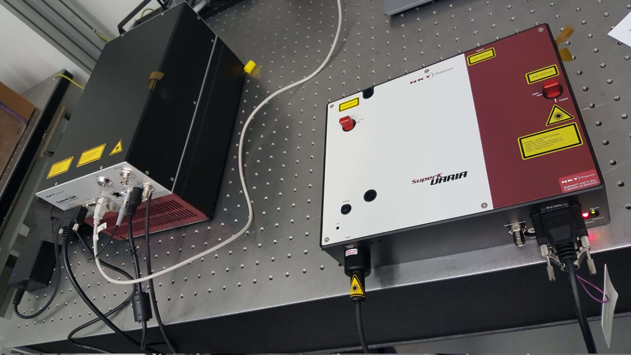Pro toto zadání jsme zvolili superkontinuální laser SuperK EVO EU-4 s filtrační jednotkou Varia. Laser pracuje na opakovací frekvenci 20 MHz a má spektrální výstup od 410 do 2400 nm s kvalitou svazku (TEM00 mod) M2<1,1. Kompatibilní filtrační modul Varia má spektrální rozsah 400-840 nm, přičemž šířka pásma je měnitelná v rozsahu od 10 do 100 nm. Ovládání celé sestavy umožňuje intuitivní software CONTROL