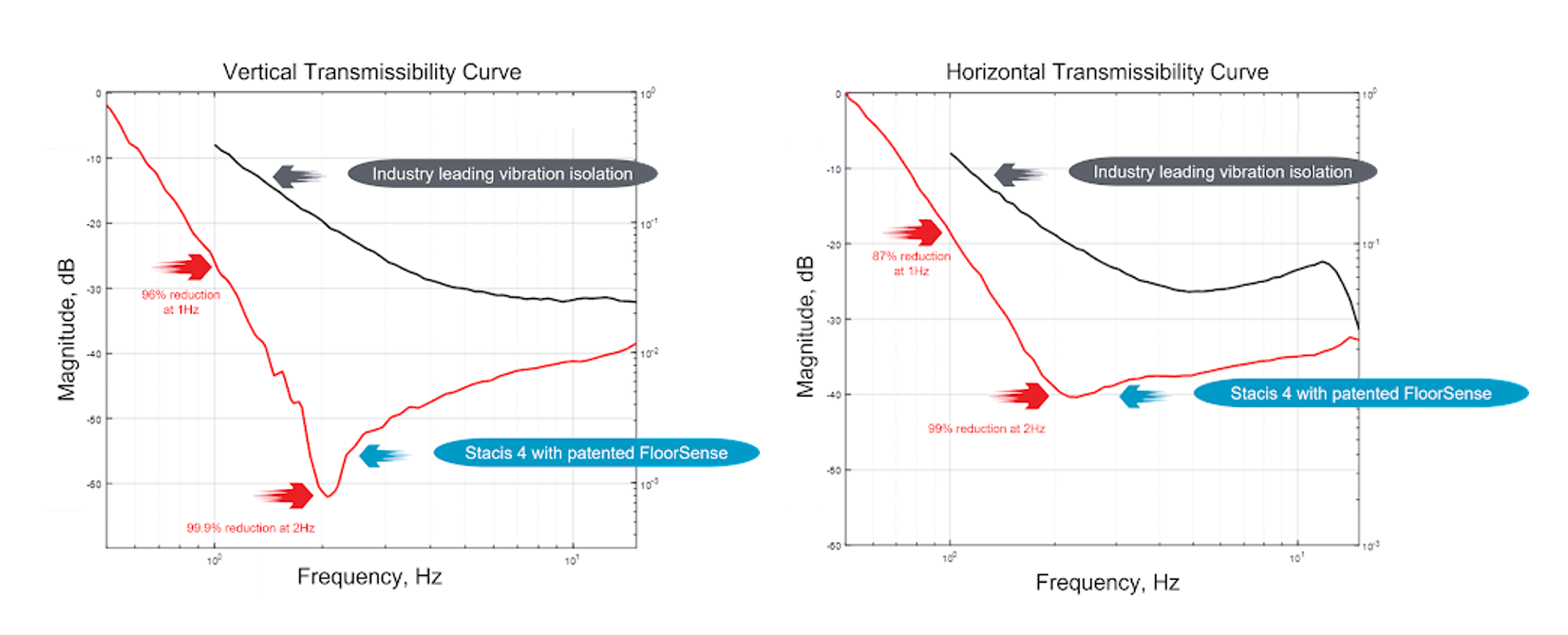 STACIS 4 staví na pokročilé architektuře předchozích generací a přidává pokročilé řídicí algoritmy a nové patentované technologie. Výsledkem je dříve nedosažitelné potlačení vibrací podlah budov na všech frekvencích, zejména však pod 10 Hz, kde je zobrazování a metrologie s vysokým rozlišením nejcitlivější. V kombinaci s patentovanou technologií FloorSense™ snižuje systém STACIS 4 vibrace podlahy budovy o 60 dB při frekvenci 2 Hz a o 27 dB při frekvenci 1 Hz. Úplné výkonnostní specifikace systému STACIS 4 jsou uvedeny níže.
