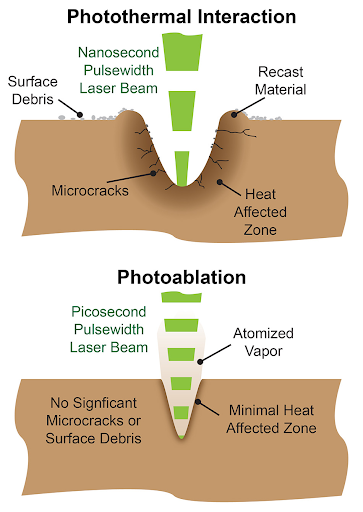 Fotoablace se používá pro nejpřesnější aplikace a aplikace, které vyžadují nejmenší HAZ (často jen 10 mikrometrů). Rychlost úběru materiálu je však obecně mnohem nižší než u fototermické ablace. Navíc jsou laserové zdroje USP obvykle větší a dražší než lasery používané pro fototermické procesy.