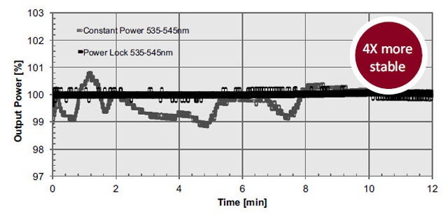 Uvedený obrázek znázorňuje výstup z filtračního modulu VARIA bez a s použitím funkce Power Lock. Kromě skvělé stability výkonu se SuperK EXTREME může chlubit nejlepší směrovou stabilitou na trhu