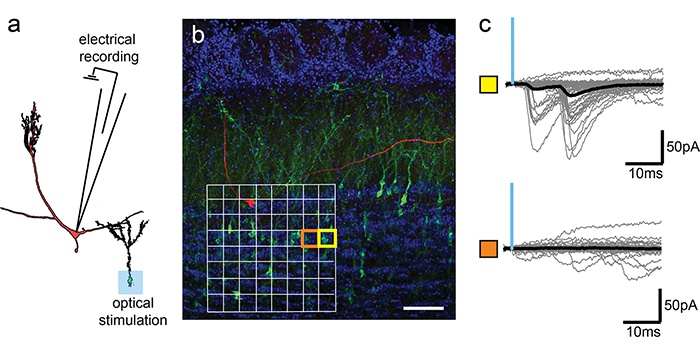 Konkrétní optogenetický experiment, při kterém byl použit modul pro aktivní osvětlení nasazený na mikroskop s možností elektrofyziologického měření, monitoruje heterogenní populace neuronů v myším čichovém bulbu (bulbus olfactorius) a jejich vzájemné propojení. Důležitými buňkami jsou v tomto případě tzv. Mitral cells (MC) propojující tzv. Granule cells (GC) čichového bulbu s čichovými centry v mozku. Optogenetická manipulace byla zaměřena na přenos signálu z GC buněk, které obsahovaly synaptický přenašeč doplněný o světlo-senzitivní Rhodopsin – ChR2 (Obrázek 1a). Aktivita MC po stimulaci GC byla měřena pomocí elektrofyziologické metody Patch Clamp (Obrázek 1b, 1c).