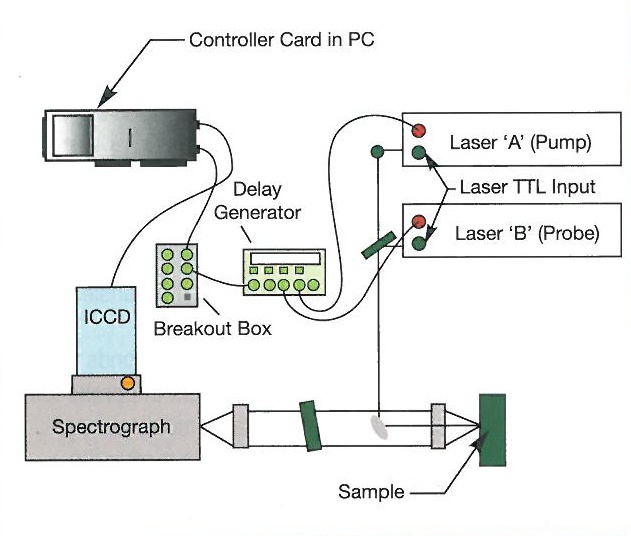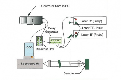 Časově rozlišená Ramanova spektroskopie (Time-Resolved Raman Spectroscopy, TRRS) umožňuje studovat mikroskopické procesy, které se odehrávají ve velmi krátkých časových intervalech. Dopadající laserový pulz vyvede zkoumaný materiál ze stavu termodynamické rovnováhy a jednotlivé molekuly se tak ocitnou v excitovaném stavu. K získání Ramanova spektra takto vybuzených molekul se pak použije stejný laserový pulz (jednobarevný pulzní Ramanův experiment) nebo pulz pocházející od jiného laserového zdroje (dvoubarevný pulzní Raman). Přiložený obrázek znázorňuje typické experimentální uspořádání pro dvoubarevné časově rozlišené měření Ramanova rozptylu pomocí dvou laserů, spektrografu s ICCD kamerou a generátoru zpoždění. Jeden laser slouží k excitaci měřeného vzorku, druhý se používá k sondování změn, které v látce vyvolal excitační pulz. Časový průběh přechodného signálu je monitorován tak, že se zaznamenává série spekter, které odpovídají různým okamžikům po fotoexcitaci.