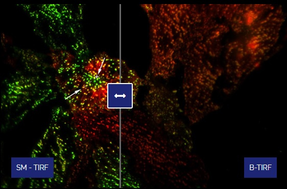 Unikátní modul Borealis® Total Internal Reflection Fluorescence (B-TIRF) je založený na patentovaném systému Borealis®. Zabraňuje interferenci a pruhovaným artefaktům vyskytujících se při standardním TIRF zobrazování a díky tomu poskytuje vynikající kvalitu obrazu. B-TIRF lze použít pro běžné TIRF aplikace, jako je zobrazování dějů na okraji buněčné membrány (např. endo/exocytóza, fokální adheze a pohyb buněk, dynamika virová infekce atd.)