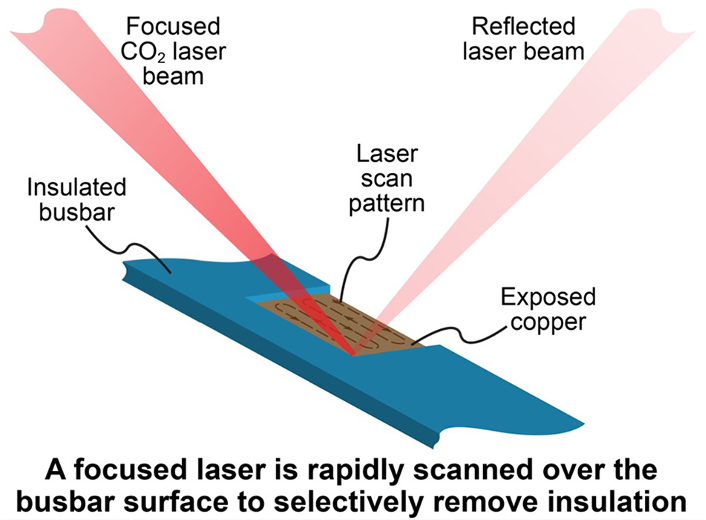 Vzhledem k těmto požadavkům jsou pro odstraňování izolace z přípojnic skvělým nástrojem lasery. Laserový proces je totiž zcela bezkontaktní a lze jej snadno konfigurovat pro práci se zakřivenými díly. Díky tomu je laserové zpracování rychlé a flexibilní. Zejména CO2 lasery jsou pro tento úkol ideální. Je to proto, že CO2 laser produkuje paprsek s vlnovou délkou se specifickými vlastnostmi. Tento paprsek je velmi silně pohlcován většinou plastů používaných pro izolaci a zároveň je vysoce odrážen mědí. To znamená, že laserový paprsek rychle odpařuje izolaci, ale jakmile narazí na podkladový vodič, neškodně se od něho odrazí zpět (protože měď paprsek CO2 laseru pouze odráž místo aby ho absorbovala). Je tedy snadné odstranit izolaci, zatímco měď zůstane zcela neporušená.