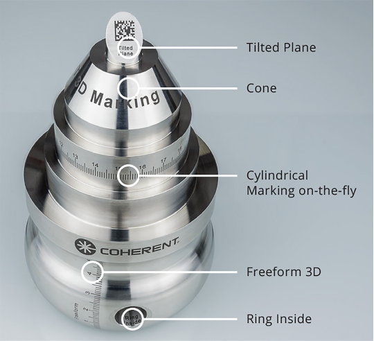 Mnoho zdravotnických prostředků je trubicových nebo plochých, ale některé nejsou ani jedno; mohou mít šikmé, zakřivené nebo neobvykle tvarované povrchy, na které je třeba značit. Po mnoho let bylo jediným způsobem, jak tyto povrchy označit laserem, uchýlit se k robotice nebo pětiosým CNC strojům. Společnost Coherent místo toho nabízí "chytré" řešení 3D značení, které kombinuje extrémně dynamickou technologii 3D zaostřování s novým 3D strojovým viděním a výkonným značkovacím softwarem nazvaným Visual Laser Marker (VLM). Ten vizualizuje relativní polohu laseru a obrobku a poskytuje přesný náhled značeného dílu. Software VLM rovněž přijímá soubory CAD s návrhem obrobku, podporuje různé typy mapování 2D → 3D a automaticky přizpůsobuje proces značení volným povrchům.