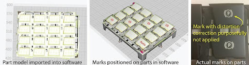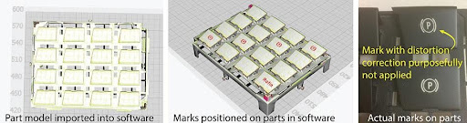 Při použití 3D značicího systému SmartMap od společnosti Coherent se do softwaru importuje model dílu CAD a uživatel umístí požadované značky na díl(y). Konečné výsledky ukazují, že k dosažení správné geometrie značky na obrobku je nutná korekce zkreslení.