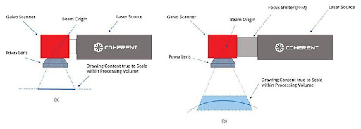 S výjimkou značení pomocí vysokoenergetických pulzů z excimerových laserů je většina laserového značení založena na skenování zaostřeného laserového bodu přes značený povrch, někdy v kombinaci se spojitým nebo krokovým pohybem značeného dílu. Třemi hlavními optickými součástmi pro realizaci tohoto procesu jsou laser, dvě galvanometrická zrcadla pro ortogonální skenování paprsku v osách X/Y a čočka pro zaostření paprsku ve správné vzdálenosti Z, tj. na pracovní povrch. Čočka je obvykle v provedení f-theta. Na rozdíl od konvenční sférické zaostřovací čočky, která má zakřivenou ohniskovou rovinu, je f-theta čočka konstruována tak, aby vytvořila plochou ohniskovou rovinu, takže hloubka ohniska laserového paprsku je nezávislá na poloze napříč čočkou. To se skvěle hodí pro rovné povrchy, které jsou kolmé na směr laserového paprsku, ale malá hloubka ostrosti znamená, že se nehodí pro 3D značení, kde se vzdálenost od zaostřovací čočky k povrchu mění.