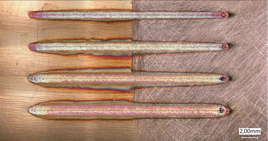 Obrázek 6: Konzistentní svary na hladké a broušené mědi pomocí laseru ARM o výkonu 4 kW při různých rychlostech (300-150 mm/s shora dolů).