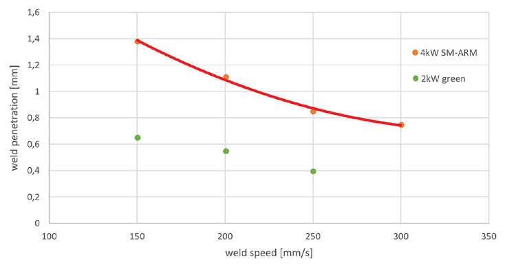 Byla také změřena účinnost svařování laseru ARM a porovnána s dříve publikovanými výsledky svařování zeleným laserem o výkonu 2 kW. Jako ochranný plyn byl pro oba svary použit dusík. Publikované údaje pro zelený laser ukázaly konstantní průřez svaru 0,5 mm² a hloubku průvaru přibližně 1 mm. Laser ARM byl nakonfigurován tak, aby dosahoval stejných výsledků. Konkrétně to vyžadovalo výstupní výkon 3,5 kW a rychlost svařování 300 mm/s oproti rychlosti svařování 200 mm/s vteřiny u zeleného laseru o výkonu 2 kW. Normalizace těchto výsledků dává lineární výkon laseru 10 J/mm pro laser ARM ve srovnání s 11,8 J/mm pro zelený laser. Zelený laser tedy nabízí o něco vyšší účinnost svařování. Vyšší celkový výkon laseru ARM však umožňuje pracovat s mnohem vyššími rychlostmi svařování, a to i přes tento malý rozdíl v účinnosti.