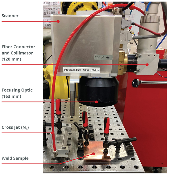 Aplikační inženýři společnosti Coherent provedli sérii testů svařování mědi pomocí laseru ARM s vysoce jasným středovým paprskem o průměru 22 µm a kruhovým paprskem o vnitřním/vnějším průměru 100 µm/170 µm. Laser byl zaostřen pomocí hlavy pro dálkové zpracování se zvětšením 1.4, s dusíkem jako ochranným plynem a křížovou tryskou. Svařovaným materiálem byla čistá měď. Výkon laseru byl 4 kW, přičemž ve středu byl výkon 1,5 kW a v prstenci 2,5 kW pro všechny testy.