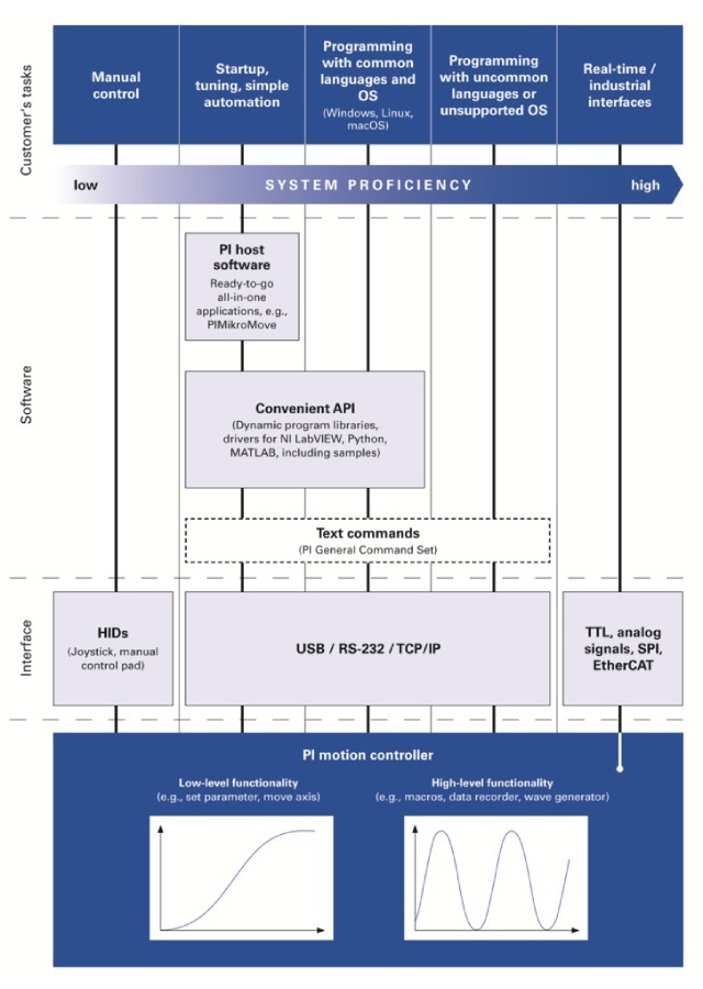 - Programovací rozhraní, knihovny, umožňují uživateli integrovat řídící elektroniku PI do svých uživatelských programů. Ovládání polohovacího systému se proto stává součástí uživatelského programu. Rozhraní je k dispozici pro všechny běžné programovací jazyky, včetně NI LabVIEW a MATLAB.