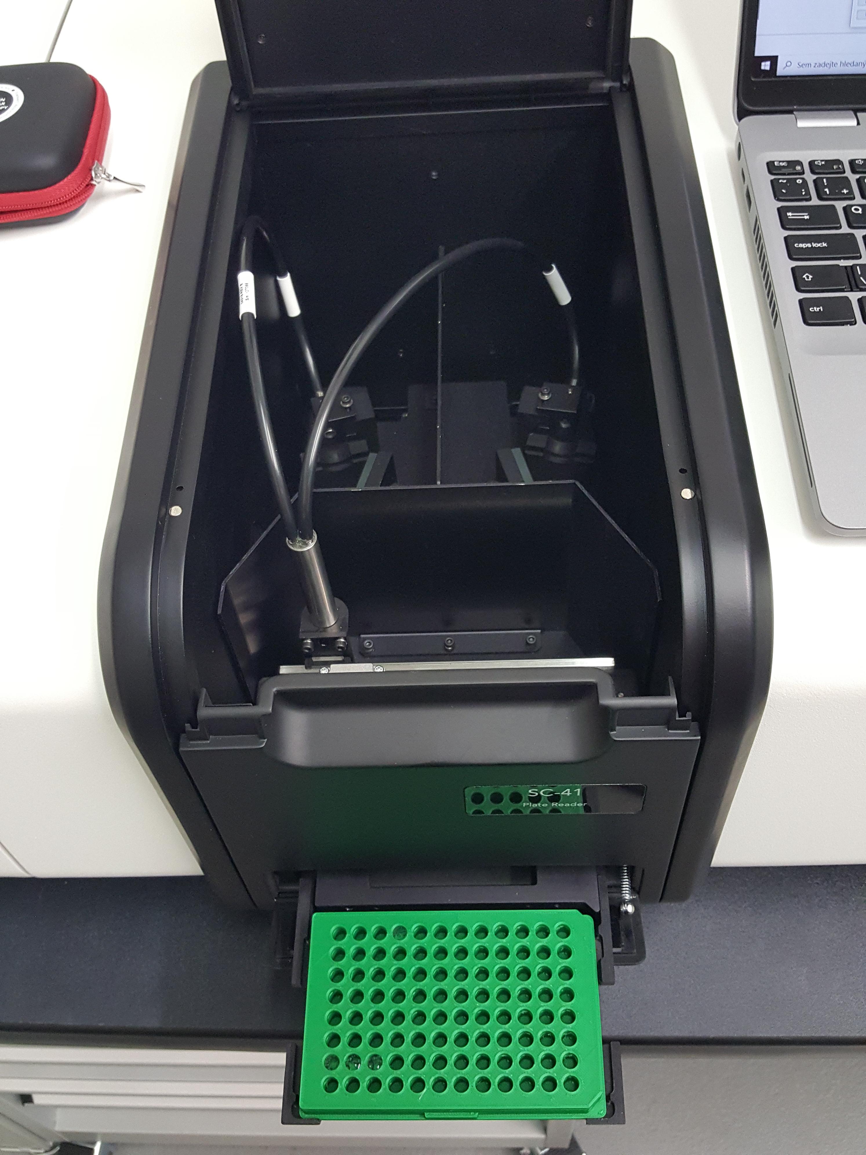Pro toto zadání jsme zvolili Plate Reader SC-41, který je navíc zcela kompatibilní s modulárním spektrofluorimetrem FS5. Přístroj je určen pro automatizované čtení 96-jamkových mikrotitračních destiček, pro každou jamku dokáže rychle zobrazit excitační a emisní spektrum a je dodáván společně s řídícím softwarem a sadou filtrů.