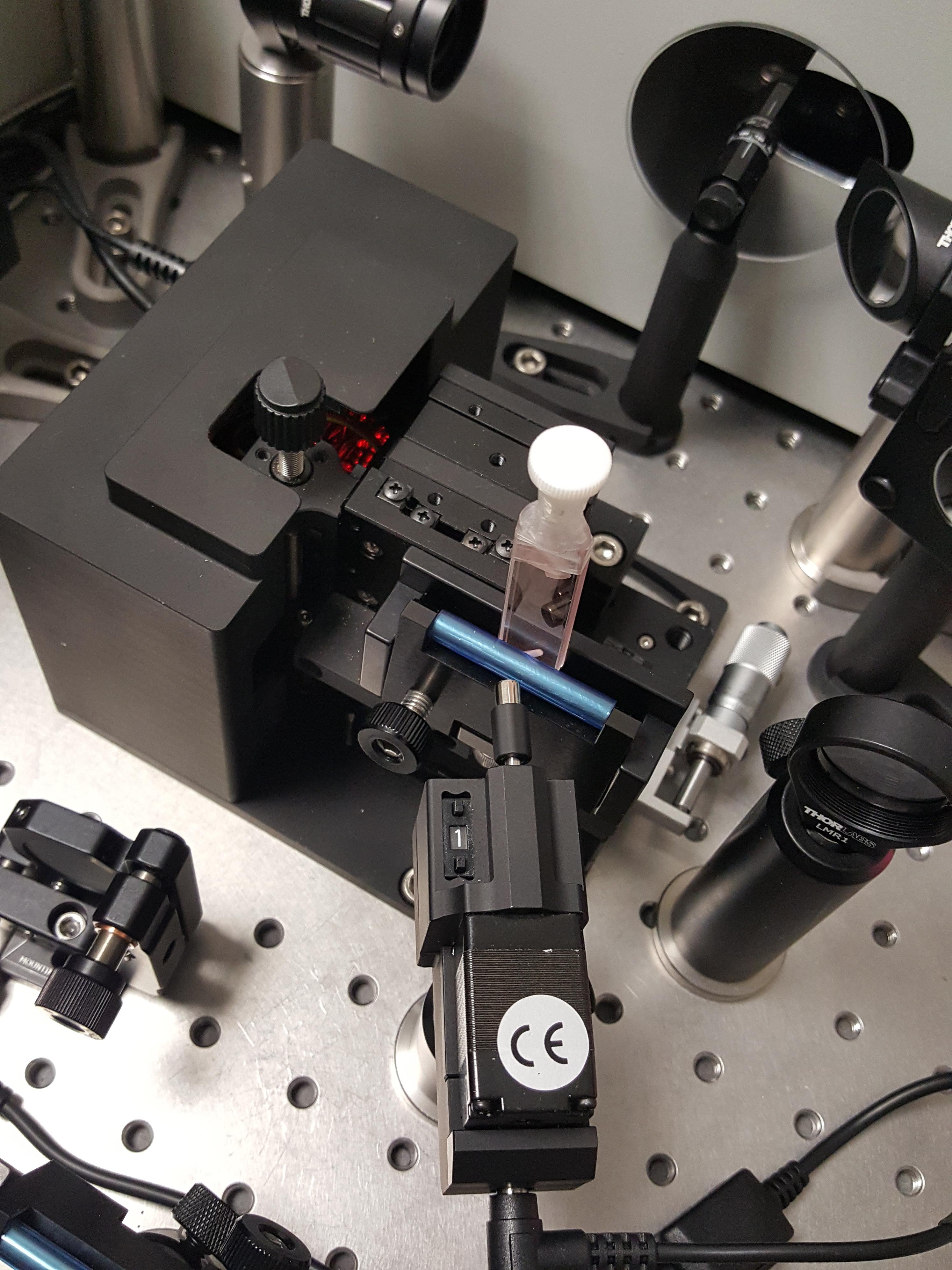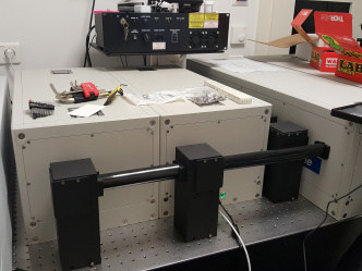 Nanosekundový spektrometr EOS jsme doplnili o femtosekundový systém HELIOS FIRE. Sondovací svazek byl naveden do nové vysokorychlostní optické zpožďovací dráhy (časové okno 8 ns, rozlišení 14 fs) a poté namířen na nelineární krystaly pro generaci UV, VIS a NIR superkontinua. K excitaci byly použity femtosekundové pulzy vystupující z optického parametrického zesilovače (laditelný rozsah 320-1300 nm). Spektrometr byl dále doplněn o motorizovaný držák pro měření transparentních pevnolátkových vzorů a o modul pro měření netransparentních vzorků v reflexním módu. Rozšířený spektrometr dokáže pokrýt časovou škálu od mikrosekund až po femtosekundy a umožňuje záznam přechodné absorpce od 350 nm do 1600 nm.