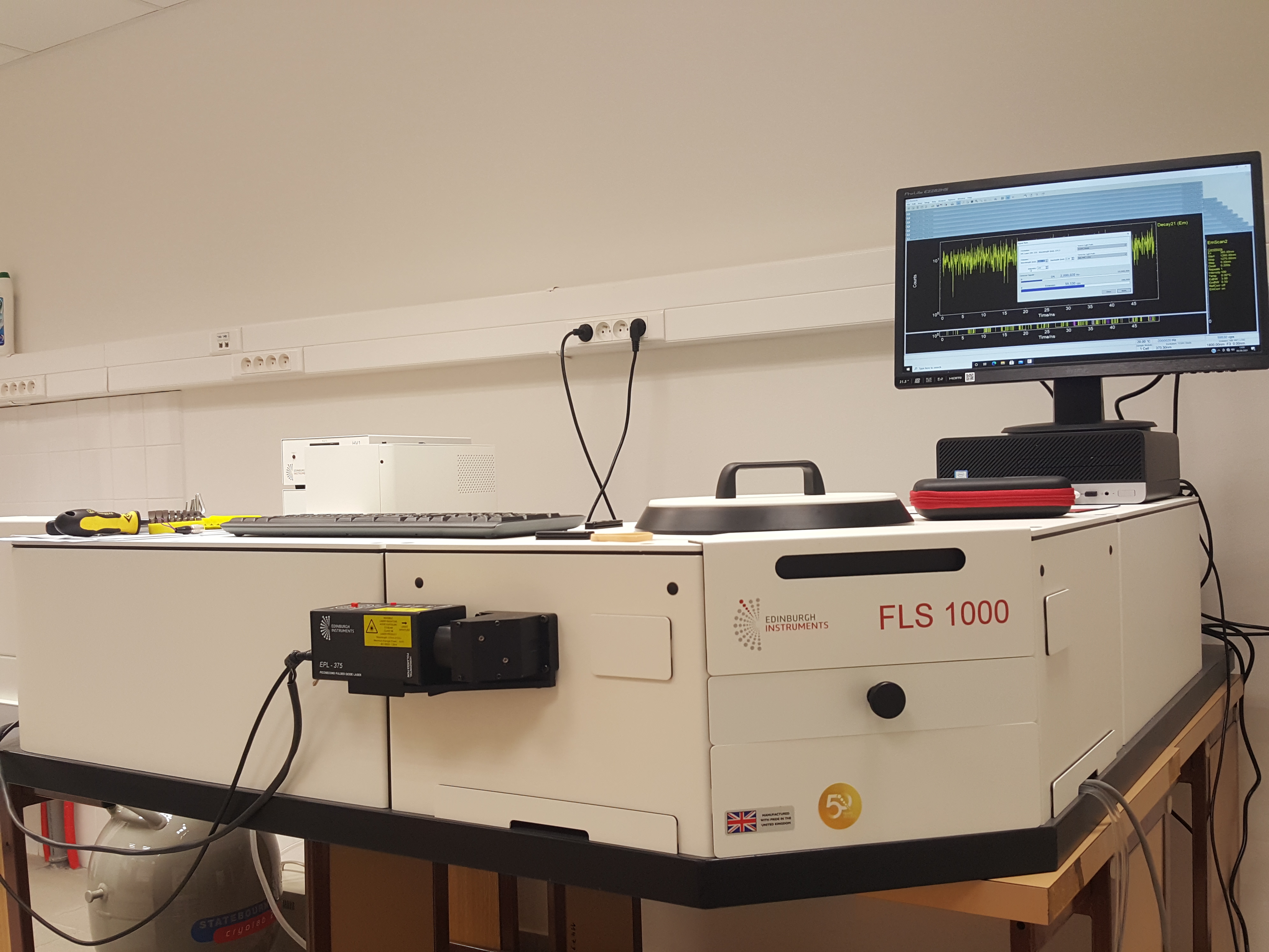 Pro toto zadání jsme zvolili modulární fotoluminiscenční spektrometr FLS1000 s dvojitými monochromátory. Tento vysoce citlivý přístroj dokáže kromě měření ustálených luminiscenčních spekter také monitorovat doby života fluorescence (TCSPC technika) a doby života fosforescence (MCS mod). Systém obsahuje rychlý UV-VIS fotonásobič s šířkou odezvy <250 ps a kapalným dusíkem chlazený NIR fotonásobič.