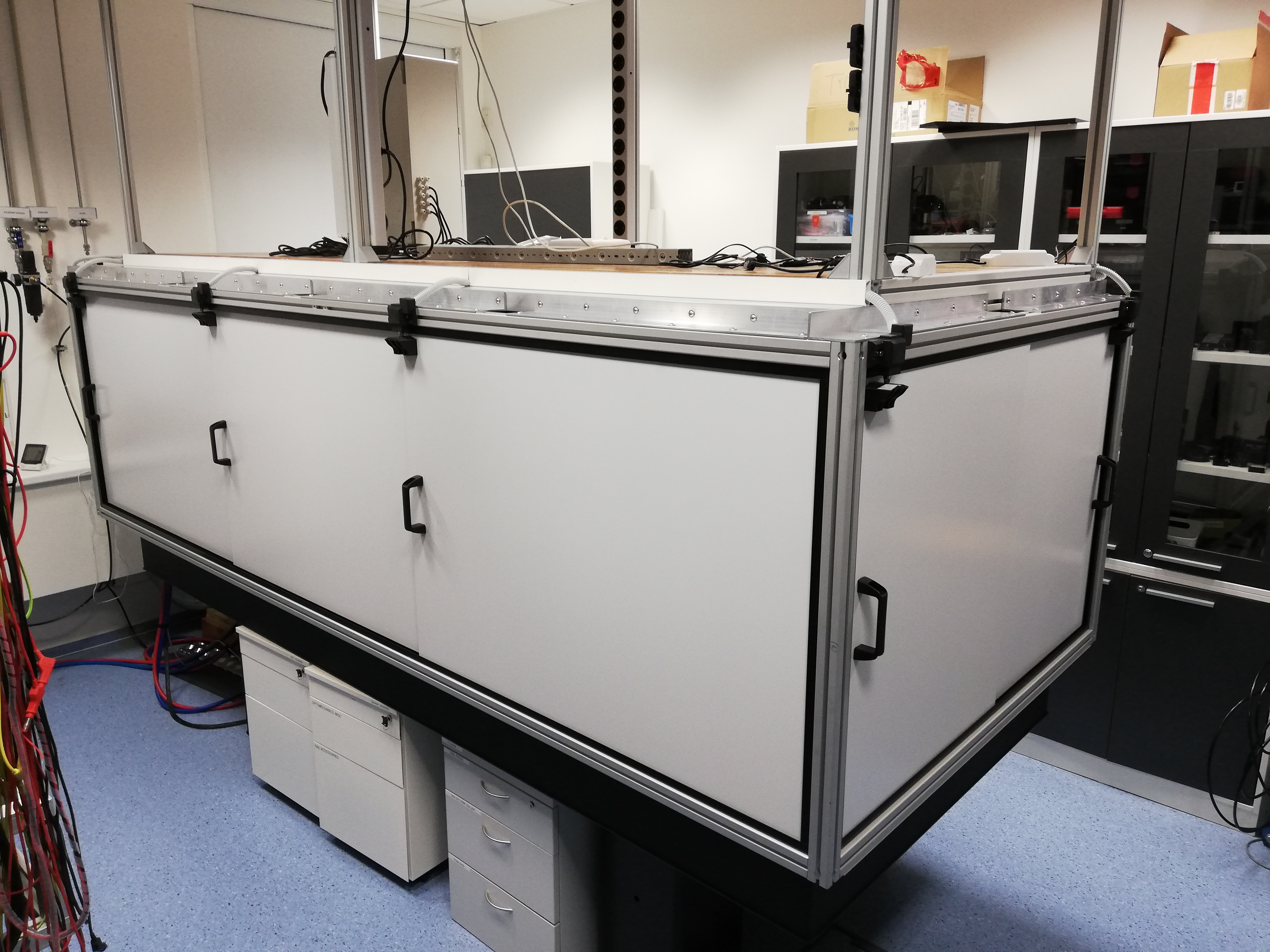 Základní konstrukce našeho krytu je vyrobena z montovaných hliníkových profilů obklopených alubondovými deskami. Po obvodu krytu je dohromady 10 posuvných dveří jejichž poloha (otevřeno/zavřeno) je monitorována pomocí bezpečnostních spínačů. Řídící elektronika krytu je napojena na interlock laseru a ten lze tak v základním stavu spustit pouze, pokud jsou všechny dveře krytu zavřené. Současně s tím je uživatel na spuštění laseru upozorněn světelnou signalizací přímo na krytu a nápisem před dveřmi laboratoře. Díky tomuto návrhu a díky dvoustupňovému zapojení hlavního bezpečnostního okruhu se tak optický stůl s laserem třídy IV stává zařazením třídy I.