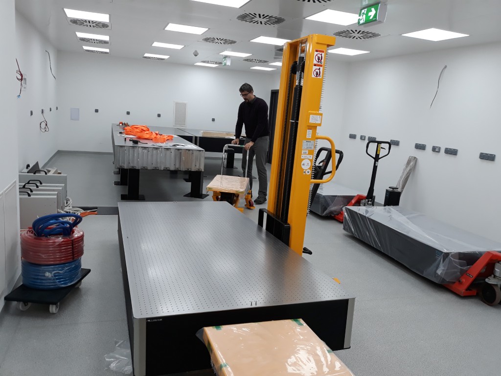 Sestava optických stolů a pevných podpěr, které mají být dodány do laboratoře v ELI Beamlines. Tyto optické tabulky budou použity v rámci projektu ELIBIO.