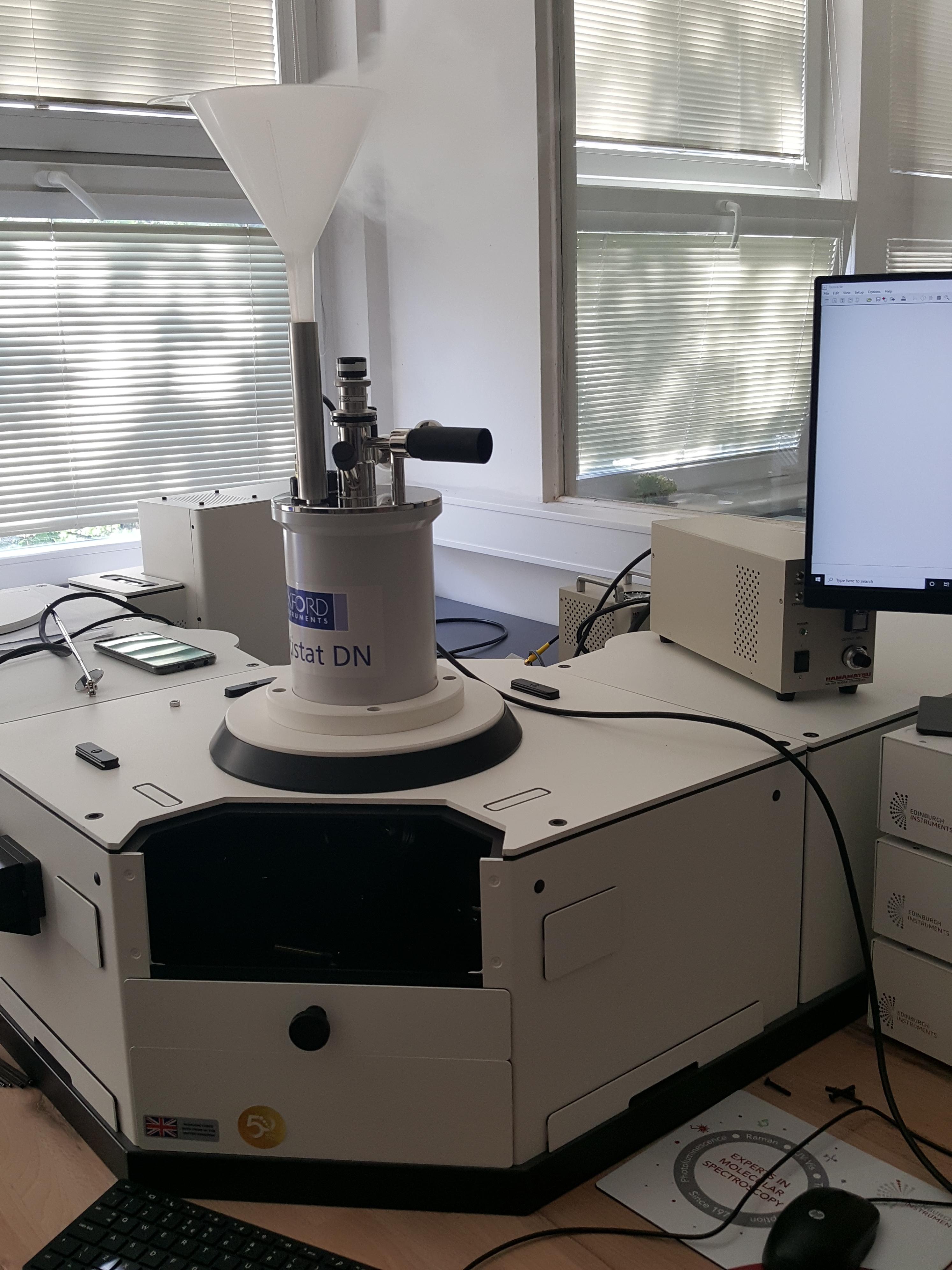 - Dusíkový kryostat se 3 vstupními okénky („T“ geometrie) a teplotním rozsahem 77–500 K