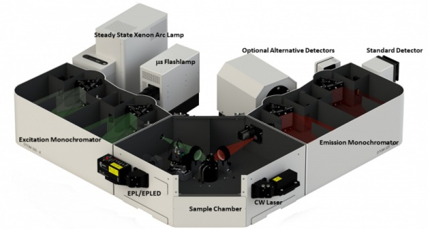 Modulární spektrometr FLS1000 od firmy Edinburgh Instruments nabízí vše potřebné pro ustálenou (Steady State) a časově rozlišenou fotoluminiscenční spektroskopii. Je vhodný jak pro základní výzkum, tak pro rutinní laboratorní aplikace. Kombinuje vysokou citlivost s vysokým spektrálním rozlišením, excelentním potlačením nežádoucího rozptýleného světla a výkonnou elektroniku pro rychlý sběr dat. Umožňuje měřit ustálená luminiscenční spektra v ultrafialové, viditelné a infračervené spektrální oblasti (až do 5500 nm). Dokáže monitorovat doby života fluorescence a fosforescence v rozmezí od pikosekund až po sekundy